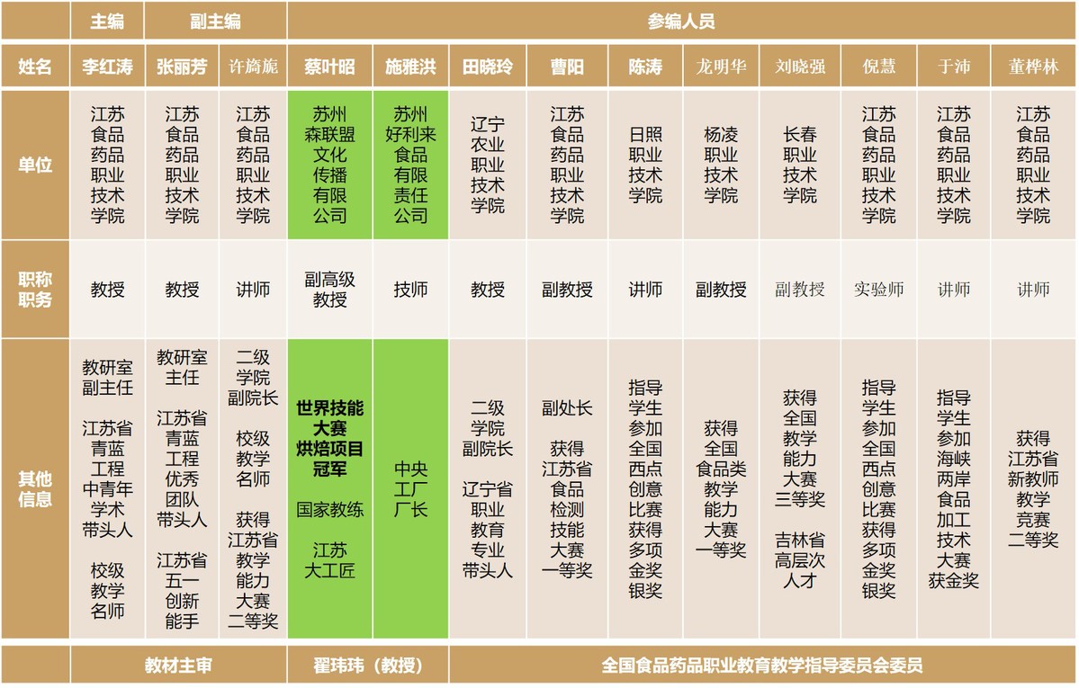 团队成员均来自“双高”院校、行企领军人才,有教授3人,高级职称人员占64%,“双师”教师占比达85%,蔡叶昭为第44届世界技能大赛烘焙项目冠军、江苏大工匠、国家级教练,施雅洪为好利来中央工厂厂长。教材主审翟玮玮教授为全国食品药品职业教育教学指导委员会委员、首届全国教材建设奖二等奖获得者。