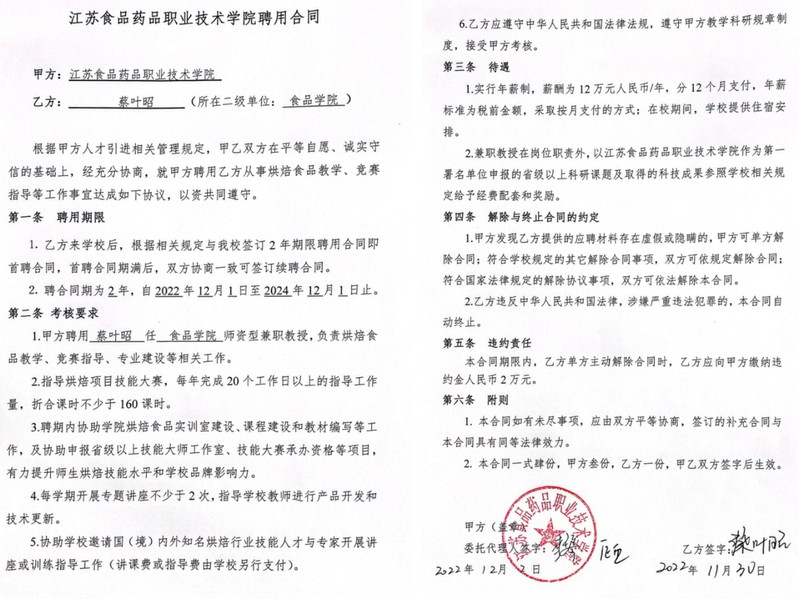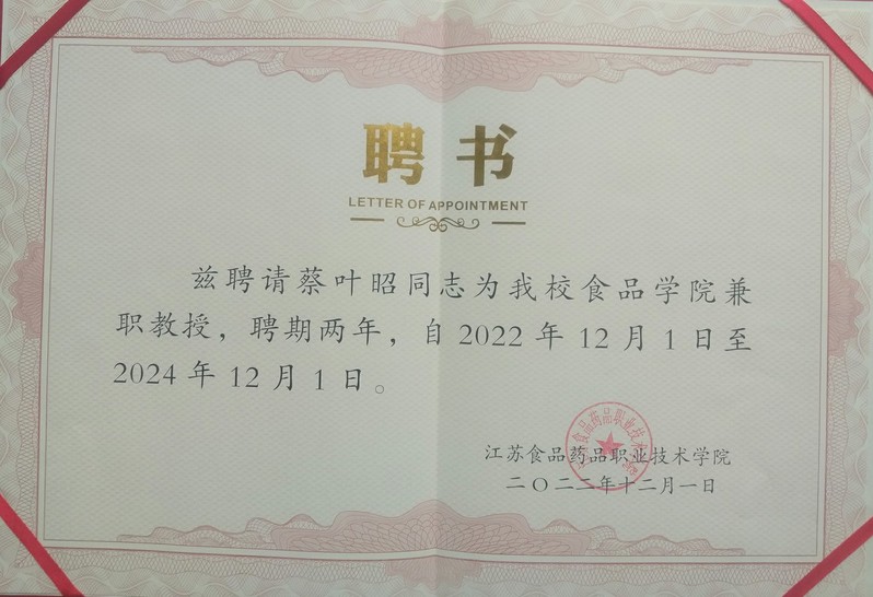 蔡叶昭担任世界技能大赛烘焙项目中国教练,培养十几名高技能人才荣获全国技术能手,多次带领选手在全国技能大赛世界技能大赛斩获奖牌,被我校聘任为兼职教授。