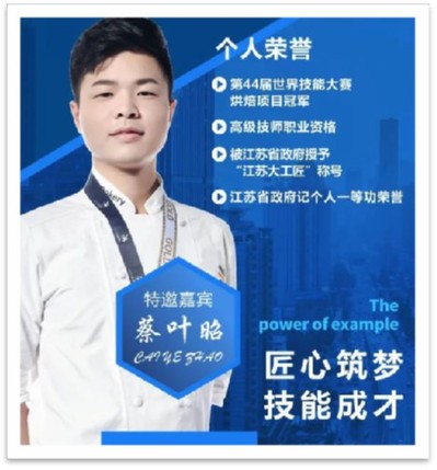 蔡叶昭,第44届世界技能大赛烘焙烘焙项目冠军,江苏省记个人一等功,荣获江苏大工匠、江苏五四青年获得者、全国技能能手、全国青年突出贡献专家,为第十三届全国青年委员、共青团第十九大团代表代表,享受政府特殊津贴等荣誉称号。